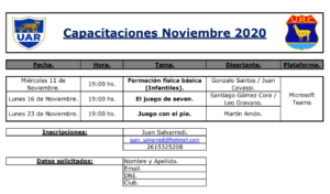 Compartimos las capacitaciones de la UAR para el mes de noviembre. Los interesados deberán enviar un email con los datos solicitados a: juan_salvarredi@hotmail.com.