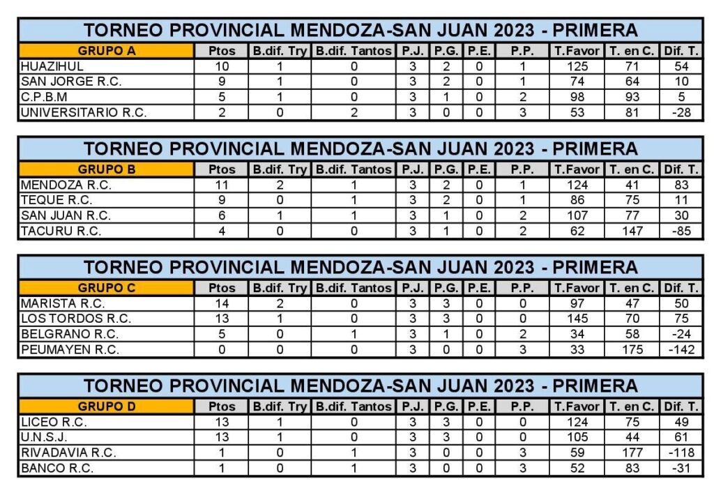 El Torneo Provincial desarrollará este fin de semana la cuarta y última fecha de la primera fase con ocho encuentros. El certamen se está disputando bajo el formato Vodacom, es decir que los equipos se enfrentarán a rivales de las otras zonas, pero acumularán puntos en su grupo. En este caso, se están enfrentando los equipos de la zona A frente a los de la zona C, y los del grupo B frente a los del grupo D, en encuentros todos contra todos a una rueda.