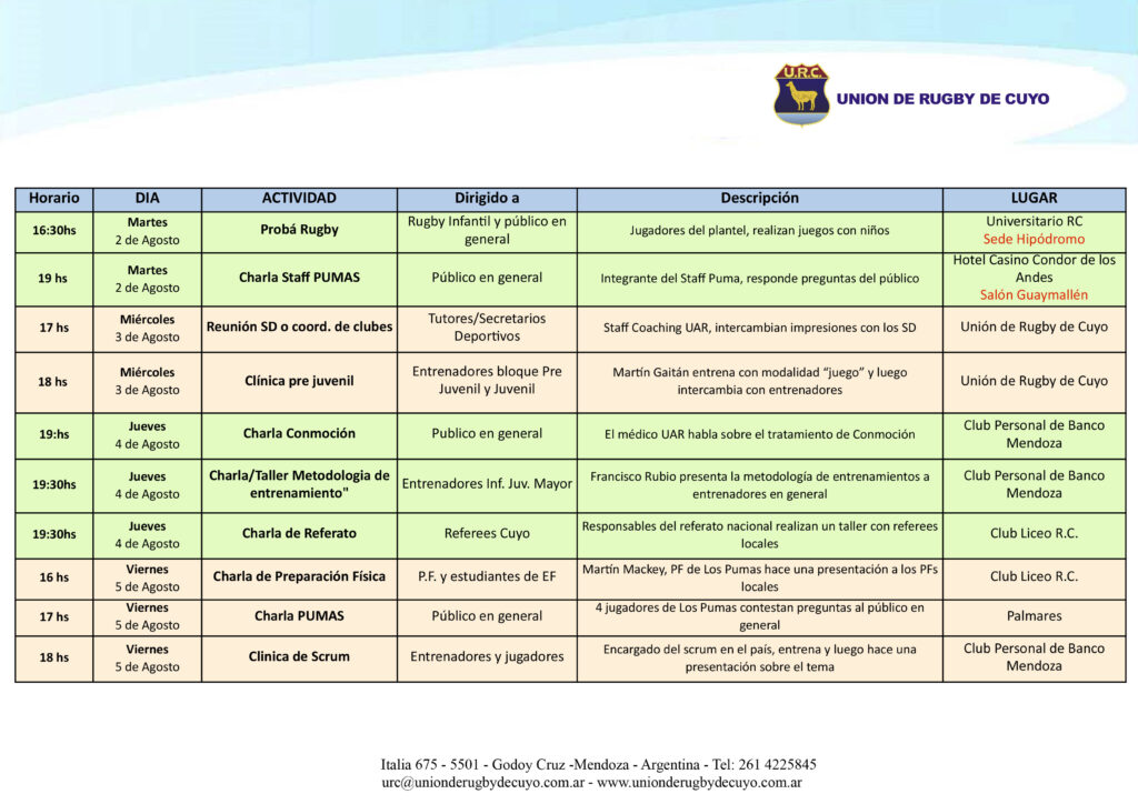 La Unión de Rugby de Cuyo informa las actividades que realizarán Los Pumas en la provincia, en la previa al encuentro que disputarán frente a Australia, el sábado a las 16.05 en el estadio Malvinas Argentinas, por la primera fecha del Rugby Championship.