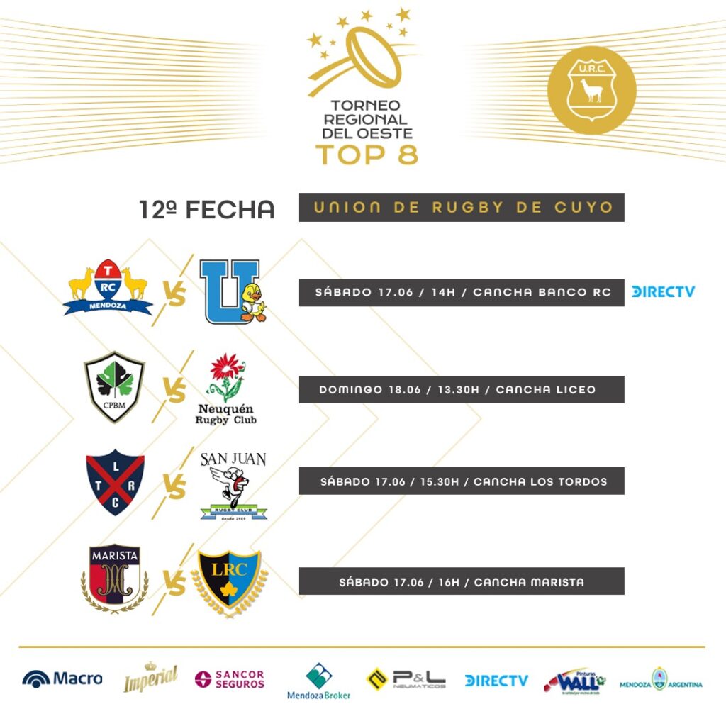 El Torneo Regional del Oeste, organizado por la Unión de Rugby de Cuyo, llevará a cabo este fin de semana la 12ª fecha del certamen en sus dos competencias más importantes, el Top 8 y la Copa de Plata.